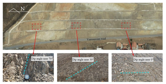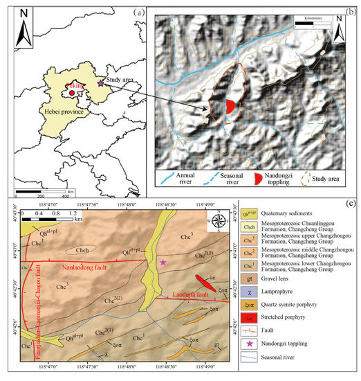 The study area is located in the northeastern part of the North China Block. The area also belongs to the northern part of Hebei province, neighboring Peking to the west (Figure 1a). The geological map compiled by the China Geological Survey (1:200,000) shows Mesoproterozoic Changcheng Group (Chc) exposed in the Nandongzi toppling region; the group is dominated by quartz sandstone interbedded with thin-layered shale (Figure 1c). The average dipping angle/dip of bedding planes is 40°/345°. This region is located north of the Malanyu Anticline, the third-order structural unit of the Yanshan orogenic belt. The nearly NS-trending Fengjiadian-Laomaojia-Chagou fault, WNW-striking Laodujia fault, and Nanlaodong fault which is a reverse fault with a dipping angle/dip of 75–85°/275°, are all developed in the study area. In addition, the Huangzhangzi syncline is exposed in the northern part of the Nandongzi toppling. The syncline belongs to the Changzhougou Group and has a strike of NNE–SSW (~65°). The dipping angle/dip of the northwest and southeast flanks of the Huangzhangzi syncline is 12°/142° and 24°/0°, respectively. According to China’s seismic parameter zoning map (GB 18306–2015), the seismic fortification intensity of the study area is VI.