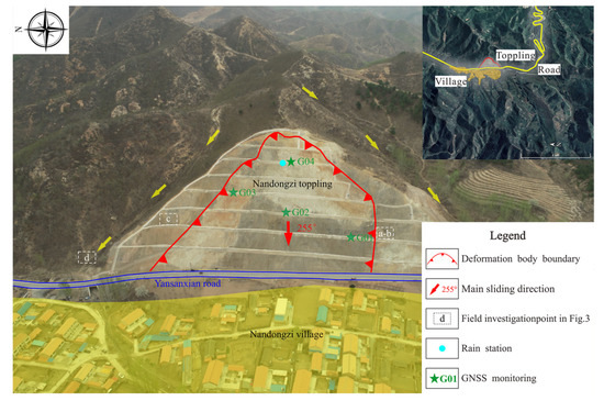 The topography of the study area is generally high-steep in the northeast but low-flat in the southwest. A seasonal river, with an ~80 m width valley, flows from north to south. However, the floodplains and terraces are not developed. The northeast ridge has the peak elevation of approximately 806 m asl, and the river valley has the lowest elevation of roughly 606 m asl, producing a maximum relief of 200 m. The mountains extend along the NE–SW direction. The elevation of the Nandongzi toppling ranges from 615 to 688 m asl and the corresponding slope is 40° (Figure 2).