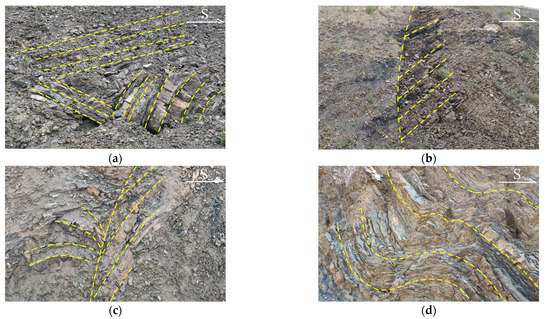 Typical bending and fracturing of the rock layers exposed on the slope surface. (a) complete fracturing; (b) different weathering degree; (c) obvious bending and fracturing; (d) bending folds.