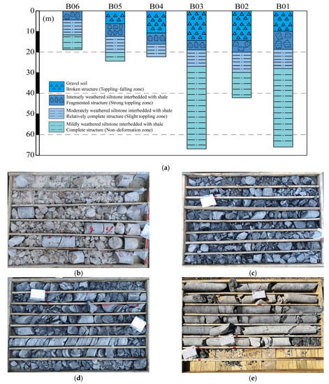Lithological sections of six boreholes (a) (the locations of boreholes are shown in Figure 4), and typical photographs of drill core quality in toppling-falling zone (b), strong toppling zone (c), slight toppling zone (d), and non-deformation zone (e).