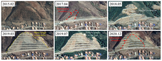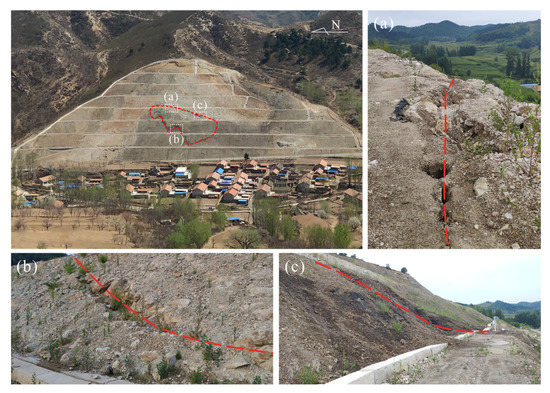 The formation process of the Nandongzi toppling is recorded by satellite imagery. In June 2016, a road named Yansanxian was excavated at the foot of the Nandongzi slope. Due to the excavation-induced unloading effect, the Nandongzi slope toppled again in 2017. A tensile crack with a width of 5–10 cm was developed at the rear edge, with a range from 619 to 645 m asl. The necessary countermeasures consisting of mult-stage excavation and drainage to improve the stability of the Nandongzi slope were implemented in 2018 and completed in the beginning of 2019. However, in July 2019, heavy rainfall induced new displacements in the Nandongzi slope. Based on detailed field investigations carried out in May and August of 2020, there are apparent underground water outlets in the foot of the slope (from 1st step to 3rd step). In August 2020, the magnitude of displacement was further enhanced, and the shear and tensile cracks expanded rapidly (Figure 8). The fractures can be divided into three types: (i) 2–3.5 m high headscarp with a length of about 30 m in the rear of the toppling; (ii) tensile fractures characterized by 1.3–1.5 m openings which have a total length of about 60 m developed in the middle of toppling; and (iii) side shear fractures which cut off drainage ditches (Figure 4).