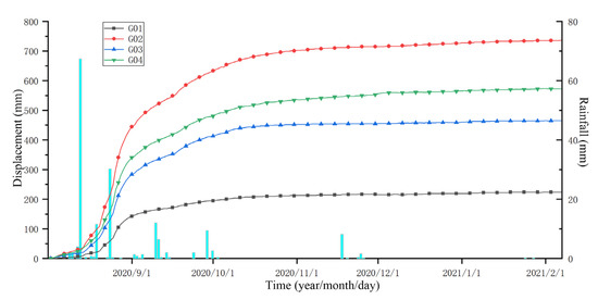 New displacement of the Nandongzi toppling and the in situ rainfall from July 2020 to February 2021.