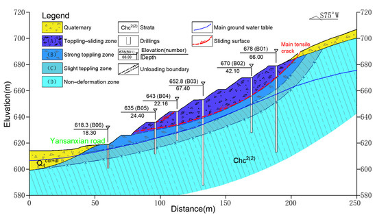 Additionally, Huang et al. [10] divided the toppled slope body into toppling-falling zone, strong toppling zone, slight toppling zone, and non-deformation zone based on their different deformation/failure characteristics (i.e., tensile-shear fractures, tensile fractures, and relative reverse slip). The toppling-falling zone tends to evolve into sliding failures [11]. Glueer et al. [14] detailed an analysis of a deep-seated landslide, formed by rotation (toppling) of steep rock columns, where the shallow secondary rockslides within the deep-seated landslide show sliding movements along planar rupture planes and mixtures of both sliding and toppling. The toppling-sliding failure is mainly developed and observed in reservoir-rim slopes under the conditions of reservoir impoundment, reservoir drawdown, or heavy rainfall [15,16,17,18].