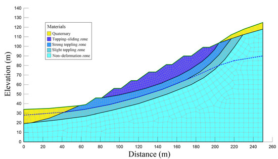 The two-dimensional finite element program SEEP/W, which can model both saturated and unsaturated flows under steady-state and transient conditions, was adopted in the present study. According to the material composition, structural characteristics, and deformation characteristics, the numerical model of the Nandongzi toppling for seepage stability analysis was successfully constructed (Figure 11). The model comprises 1467 nodes and 1415 quadrilateral mesh elements (Figure 12). At the beginning of the transient seepage analysis, a hydrostatic condition was established based on the groundwater level revealed by borehole drilling. The water table assigned at 2 m below the ground surface would undoubtedly produce a realistically negative pore-water pressure (27 kPa) near the surface [30]. The left and right edges below the water table were assigned as head boundaries with pressure heads equal to 28 m and 90 m, respectively. In contrast, the left and right edges above the water table, as well as the bottom edge of the model were specified as no-flow boundaries. The rainfall-induced seepage was simulated by applying a unit flux (q) of varying intensities on the exposed slope surface.