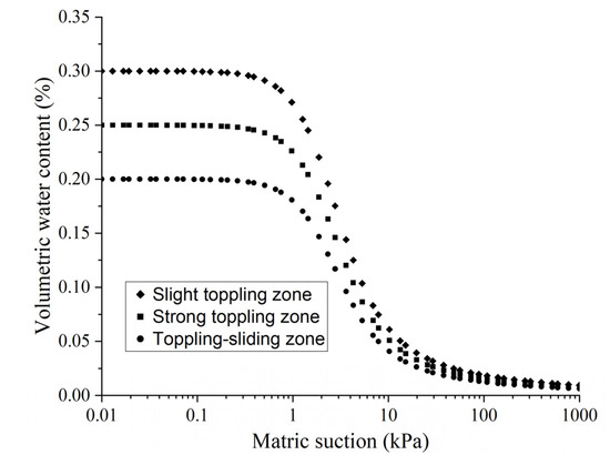 SEEP/W includes a set of sampled volumetric water content (VWC) functions for soils with varying textures. The VWC functions adopted here correspond to gravel material with saturated water contents of 0.2, 0.25, and 0.3 for toppling-falling zone, strong toppling zone, and slight toppling zone, respectively (Figure 13). Based on the double-ring seepage tests operated in the toppling-falling zone and differential zonation characteristics of the toppled rock masses, the soil–water characteristic curves (SWCC) were then estimated using the Van Genuchten method [33], in which the saturated hydraulic conductivity (Ksat) was specified as 1 × 10−4 m/s, 1 × 10−5 m/s, and 1 × 10−6 m/s for toppling-falling zone, strong toppling zone, and slight toppling zone, respectively (Figure 14). The Mohr–Coulomb model was applied in the toppling-falling zone, strong toppling zone, and slight toppling zone, while the “solid” model was utilized in the non-deformation zone. Based on the standard testing methods consisting of direct shear tests and unconfined compression tests operated in the laboratory, the strength and physical properties of rock and soil materials in different zones were determined through the trial-and-error “back analysis”. The trial-and-error “back analysis” was performed in terms of the monitored maximum rainfall (67.4 mm). We applied a flux value (Q) of 7.8 × 10−7 m/s at the boundary for 24 h. The properties listed in Table 3 provided the modeled results (Figure 15) that best reproduced the real stability state and displacement from the field survey and monitoring (Figure 9). In detail, the overall factor of safety is 1.229 (Figure 15a), but the local factor of safety is 0.959 (Figure 15b), which almost coincides with the secondary sliding zone developed within the Nandongzi toppling (Figure 16); in addition, the maximum deformation displacement is approximately 0.85 m near the foot of slope (Figure 15c), which almost coincides with the monitored data from G02 (i.e., 0.73 m), and the deformation displacement is 0.43 m at the G04 monitoring site.