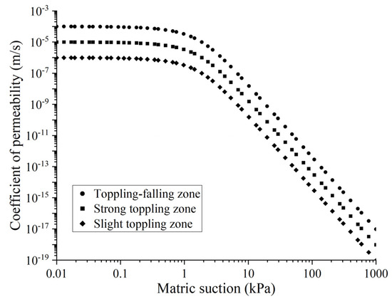 In this study, we assumed that the transient water flow through unsaturated soils under rainfall infiltration obeys Darcy’s law [32]. In unsaturated flow, the coefficient of permeability (hydraulic conductivity) is a function of water content or matric suction in unsaturated soils, which is conventionally assumed to be a constant in saturated soils [26].