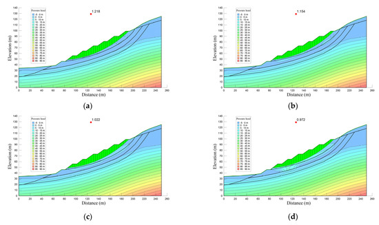 Transient seepage analysis was performed under different return periods (5, 20, 50, and 100 years) using SEEP/W. The pore-water pressure profile computed from the seepage analysis was integrated into slope stability analysis using SLOPE/W, and the results are shown in Figure 17. Due to limited space, pore-water pressure distributions are not discussed in this study.