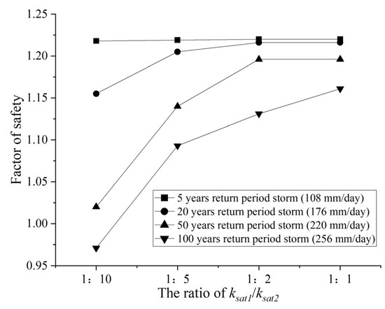 In addition, different saturated coefficients of permeability of the strong toppling zone (i.e., ksat1 = 1 × 10−5, 2 × 10−5, 5 × 10−5, and 1 × 10−4) were applied to study the effect of the ratio of ksat1/ksat2 on the stability of the Nandongzi toppling, while saturated coefficients of permeability of the toppling-falling zone (ksat2 = 1 × 10−4, i.e., the ratio of ksat1/ksat2 = 1:10, 1:5, 1:2, and 1:1, respectively) and other conditions remain unchanged. It can be seen in Figure 18 that the factor of safety increases as the ratio of ksat1/ksat2 increases, but the increase rates are affected by rainfall intensity. Notably, these rates are significantly greater in high rainfall intensity, suggesting that the ratio of ksat1/ksat2 and rainfall intensity control the pore-water pressure, which the safety factor of the Nandongzi toppling is susceptible to, developed at the boundary between the toppling-falling zone and strong toppling zone.