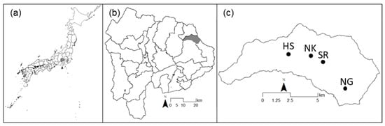 Map of the study sites. Maps of Japan (a), Yamanashi Prefecture (b), and village of Kosuge (c) are shown. HS: Hashidate, NK: Nakagumi, SR: Shirasawa, NG: Nagasaku.
