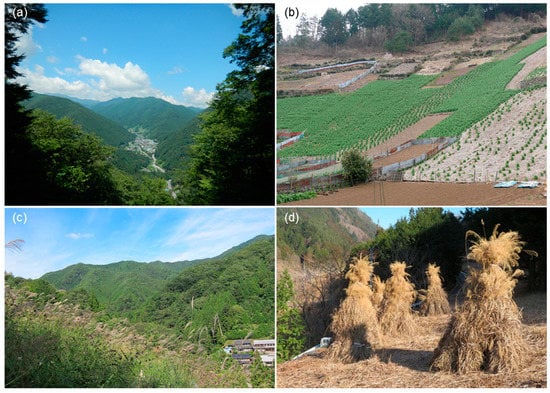 There has been a rapid global decline in traditional agricultural landscapes, including in Europe [1,2,3], South Asia [4], Southeast Asia [5,6], and East Asia, including China [7] and Japan [8,9,10,11]. A traditional agricultural landscape is a landscape in which traditional sustainable agricultural practises are currently carried out and where biological diversity, including agrobiodiversity, is thereby conserved [12]. For example, in Japan, the traditional agricultural landscape known as ‘Satoyama’ [13] extends between the cities and the deep mountains and combines various environments such as vegetable fields, rice paddies, grassland, irrigation ponds, ditches, woodland, and residential areas [9]. This Satoyama is located mostly in forested hilly or mountainous areas and covers roughly 67% of the total area of the country [8]. However, this traditional agricultural landscape is declining rapidly because it is usually located in hilly or mountainous areas that are strongly affected by the factors that lead to agricultural abandonment, such as unfavourable environmental conditions (e.g., remote and isolated areas, higher elevations, steeper slopes, poorer soils, and poorly ameliorated agricultural fields), farms with smaller areas, and land owned by part-time farmers and older landowners [14]. Although the abandonment of traditional agricultural land may have positive effects on ecosystem services, such as an increase in carbon storage due to forest regrowth, it also has significant negative effects, such as soil erosion, a reduction in biodiversity, water provisioning, landscape heterogeneity, and cultural and aesthetic amenity [15,16].