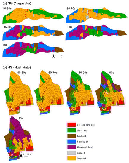 Land use patterns in the 1940–1950s, 1960–1970s, 1980–1990s, 2000s, and 2010s in (a) NG and (b) HS.