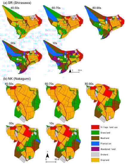 Land use patterns in the 1940–1950s, 1960–1970s, 1980–1990s, 2000s, and 2010s in (a) SR and (b) NK.