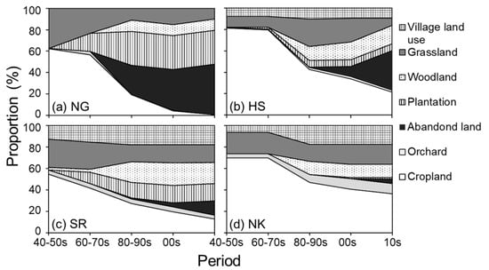 The area occupied by woodland increased from the 1980–1990s onwards and accounted for between 10% and 19% of the total land area by the 2010s (Figure 6). The area of plantations also increased from the 1960–1970s, except in NK. While village land use was not appeared in NG irrespective of the time period, the area of village land use in the other three blocks was either unchanged (HS and SR) or increased (NK) over the study period.