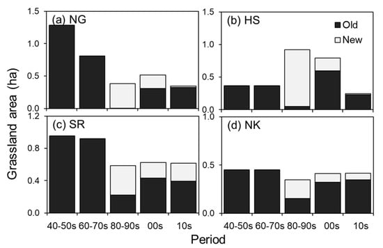 Change in grassland area in (a) NG, (b) HS, (c) SR, and (d) NK from 1940 to 2019. Two types of grassland are shown separately: grassland that has remained unchanged from the previous period (old) and recently established grassland (new).