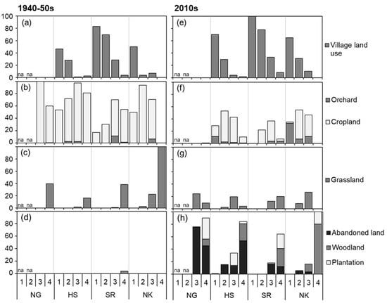 Area proportion (%) of each land use type by accessibility index (1–4) and block in the 1940–1950s (a–d) and the 2010s (e–h). An index of 1 indicates the most accessible parcel and an index of 4 indicates the least accessible parcel. na = not available.
