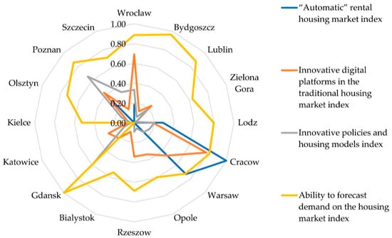 There is a large variation in estimates for all dimensions of smart housing concepts between cities in Poland. Cities such as Krakow, Warsaw, and Wroclaw achieve relatively good results in almost every category of smart housing. This is not the case for cities such as Zielona Góra, Kielce, and Bialystok [26].