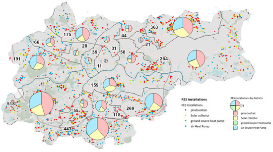 Smart cities are able to utilize their ecological potential, value energy, and change the way cities are developed. In the case of Krakow, such actions have been most visible since 2016, however, the last few years have also shown the financial benefits that the real estate market has taken on. Since 2020, the city has been running the Renewable Energy Development Program (PROZE in Polish), through which residents have the opportunity to receive grants for environmental protection tasks related to local renewable energy sources and the introduction of more environmentally friendly energy carriers. The program allows for the financing of heat pumps (ground and air), solar collectors, and photovoltaic installations in buildings and residential premises. The program has been very popular with Krakow residents since its inception, especially in the field of photovoltaics. In two years, the city has granted 1332 grants for RES installations, including 1120 (84%) for photovoltaic panels. The total amount of grants granted under PROZE is over PLN 19.6 million. Figure 4 shows existing renewable energy source installations taking into account the districts of the city of Krakow.