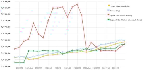 March 2020 was a turning point in the primary housing market in Krakow. The lockdown distorted the entire real estate market. Before the pandemic, prices were rising at a two-digit rate annually. Subsequent years brought price increases, reduced apartment sizes, and exclusive eco-friendly and resident-friendly investments. This can be seen in the southern part of the city, where substantial changes in property prices (orange in Figure 8) are visible. In subsequent years there was an increase in investments, averaging 20 per year, with 300 new ones planned for 2023.