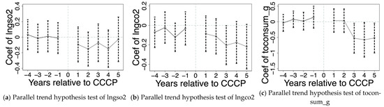 The CCCP has been implemented since 2011; therefore, we take 2011 as the base year. denotes the impact in period τ before the policy treatment, and β+τ denotes the impact in period τ after the treatment. Xit is the control variable, including pgdp, industry, pop, tec, fdi, and coal_c; β denotes the impact of the current treatment period, so takes the value of 1 when the year is the treatment period, otherwise it takes the value of 0. If β−τ, β′−τ, β″−τ are not significant, the parallel trend hypothesis is valid; μi, μ′i, μ″i and γt, γ′t, γ″t are vectors of city and year dummy variables that account for city and year fixed effects. are the random disturbance terms.