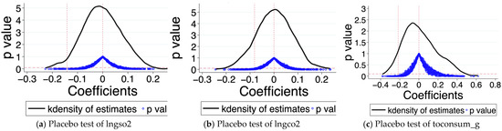 Placebo test (Notes: The X-axis indicates the magnitude of the estimated coefficients of the “pseudo-policy dummy variables” and the Y-axis indicates the magnitude of the density values and p-values).