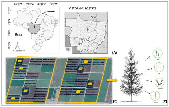 (A) Experimental area, (B) experimental design, and (C) sample collection scheme, where DB = dead branches and FB = fresh branches. Sources: (A) Cornélio Alberto Zolin and (B) Gabriel Rezend Faria.