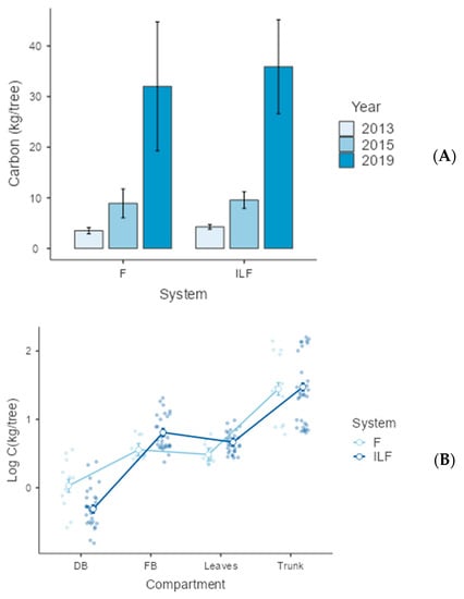 Carbon stock dynamics of eucalyptus in monoculture (F) and integrated livestock-forestry (ILF) over eight years for (A) total biomass, kg tree−1 (bar plots represent standard deviation) and for (B) dead branches (DB), fresh branches (FB), leaves, and trunk (kg tree−1) in log scale (bar plots represent confidence interval).