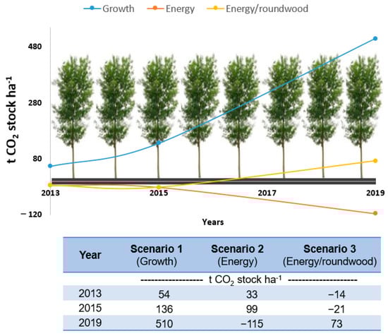 As mentioned earlier, harvested biomass can also be used as industrial-grade roundwood, where the carbon stored has a longer life cycle. However, in addition to roundwood, parts of the eucalyptus planting, namely the wood residues, are used for energy. Thus, the amounts of carbon stock from bioenergy and from forest products are determined endogenously by the yield level of both, stocking 9.1 t CO2 ha−1 yr−1 for Scenario 3 (Figure 4).