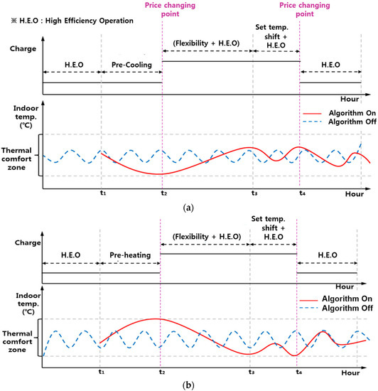 Pre-cooling or pre-heating is an operation that lowers or raises the indoor set temperature within a comfortable range, lower or higher than that set by the user, during the time period (t1–t2) prior to peak electricity rate periods. The comfortable temperature range can be calculated using various comfort indicators, but in this study, the user-set temperature (Tset) ± 1 °C was conservatively used. The t1–t2 time period was set to a range of 10–60 min to prevent an increase in energy consumption resulting from excessive pre-cooling and pre-heating. The time required for the room temperature to reach Tset ± 1 °C, i.e., the pre-cooling or pre-heating temperature, was recorded and applied to the same time period the next day. For example, if electricity rates are high at 13:00 in cooling operations, and it took 30 min to reach the pre-cooling temperature of Tset − 1 °C the previous day, on the next day, pre-cooling starts at 12:30. If the pre-cooling temperature is reached 20 min later (at 12:50), pre-cooling starts at 12:40 the next day; however, if the room temperature fails to reach Tset − 1 °C within 30 min, pre-cooling starts at 12:25, with an increase of 5 min the next day. A study to determine the appropriate time using a predictive model in terms of the pre-cooling time will be needed in the future. Indoor heat storage exhibits a time lag phenomenon, which has the effect of dispersing peak load by storing heat in structures such as indoor spaces, building walls, and floor slabs. Thus, through pre-cooling, electricity rates can be reduced in buildings adopting the TOU rate plan [18,19].