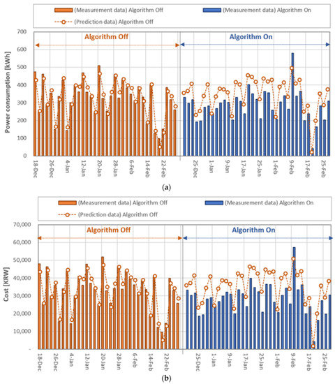 Powerc denotes the power consumption of the outdoor cooling unit (kWh); Costc denotes the cooling electricity rates (KRW); Tout denotes the outdoor temperature (°C); Qindoor denotes the load factor (%); and a, b, and c denote the regression model coefficients (unitless). The coefficient of determination of the regression model was 0.93 for the power consumption prediction model and 0.88 for the electricity rates prediction model, both of which satisfied the IPMVP criteria. Furthermore, the p value of the F statistic was also confirmed to be statistically significant, as both models exhibited values less than 0.05. Figure 4 shows the cooling effect verification results using regression analysis. The outdoor temperature and indoor heat load of the operation with the algorithm were entered into the regression model, derived through the operation data without the algorithm, to calculate the power consumption and electricity rate, as well as their effectiveness, by comparing them with the actual measured values. As a result, the operation with the algorithm reduced power consumption by 4.0% and electricity rates by 7.3% compared to the operation without the algorithm at the same outdoor temperature and indoor heat load.