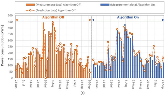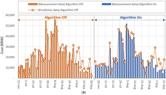 Figure 3 shows the results of verifying the heating effect on electricity consumption and electricity rates using regression analysis. The bar graph is the actual measured power consumption and electricity rate, while the dotted line graph is the power consumption and electricity rates calculated through the regression model for operation without the algorithm (baseline). In the period when the algorithm was not applied, the actual measured power consumption and the value calculated through the model were almost consistent. During the algorithm application period, the actual measured power consumption was less than the value calculated by the model. The difference between the measured value and the value calculated from the model indicates a saving effect due to the application of the algorithm at the same outdoor temperature, outdoor unit operation time, and indoor heat load. The same pattern is also seen in the electricity rates. The comparison showed that power consumption and electricity rates were reduced by 17.8% and 19.2% for the heating and cooling models, respectively, due to application of the algorithm.