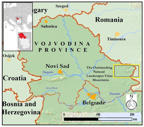 - Bjeljac, Ž.; Romelić, J. Tourism on Vršac Mountains; Geographical Institute “Jovan Cvijić“, Serbian Academy of Sciences and Arts: Belgrade, Serbia, 2015. [Google Scholar]