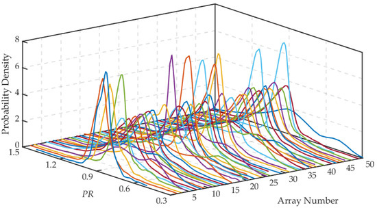 - Array PR uncertainty modeling: The probability model of arrays was established by using the non-parametric KDE method. After analysis, it was found that the peak density of the array kernel with large cumulative power generation was large. Thus, the evaluation index of the state division was determined as the peak value of probability density curves.