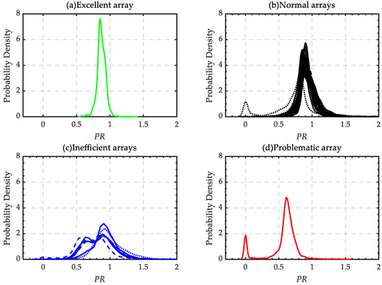 - Determination of threshold for array operating state partition: The 3σ method was used to classify the peak value of the probability density curve into four grades (i.e., excellent, normal, inefficient, and problematic), and determine the threshold of different states.