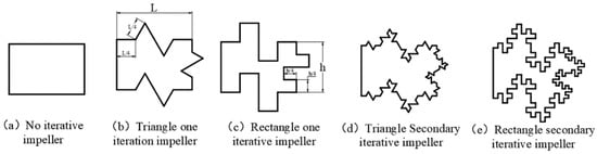 Fractal geometry swept fluids tend to produce unique turbulence characteristics and the design of a fractal impeller with a fractal boundary has a good optimization effect in many cases. Nedi’c [16] studied the air sweeping process of fractal structured plates and found that the drag coefficient increases with the number of fractal iterations and the wake size decreases with the increase in the fractal dimension. Steiros [17] designed a class of fractal impellers and found that the fractal blades can reduce the mixing power and drag. Bas bug et al. [18] further investigated the reason for the ability of fractal impellers to reduce energy consumption and drag, and found that it comes from the tail vortex refinement due to the special boundary. Gu et al. [19,20] conducted numerical simulation experiments on the mixing process of a kind of fractal impellers and found that this type of fractal impellers can improve the mixing uniformity and reduce the mixing power.