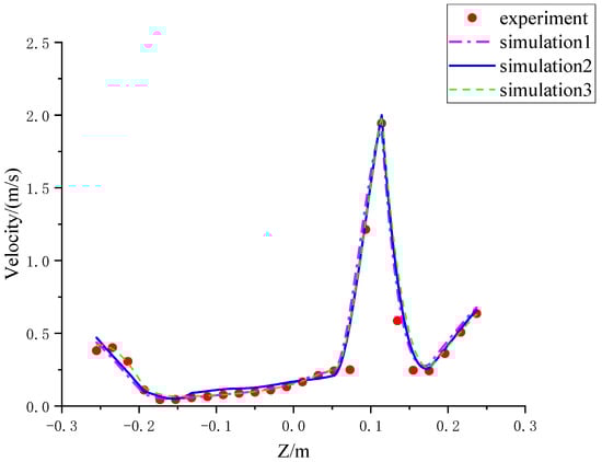 - Using the mesh and boundary settings above, three sets of simulations were performed for the same case as the experiments. The vertical line velocity at the same position was derived for each simulation, and the curve was fitted and compared with the experimental data in step (1), as shown in Figure 5, where the horizontal axis is the axial distance, and the vertical axis is the speed of the monitoring point;
