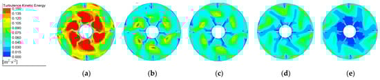 Longitudinal turbulent energy distribution of each impeller flow field. (a) Non-iterative; (b) triangular one; (c) triangular secondary; (d) rectangular one; (e) rectangular secondary.