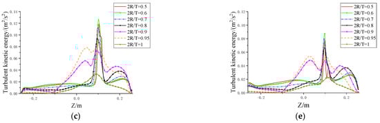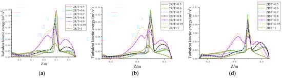 The turbulent kinetic energy distribution characteristics of the impeller zone show different characteristics with the changes in the fractal dimension and the number of iterations, but the distribution characteristics near the tank wall zone and the middle zone are not obvious. In order to further study the intensity characteristics, an observation line was selected every 10 mm from the edge of the crossing impeller region, where 2R/T = 0.5 occurred to the edge of the mixing tank, 2R/T = 1 occurred in the middle 45° plane, and an additional observation line of 2R/T = 0.95 was added. The turbulent kinetic energy variation of the fractal impellers with the off-impeller radius is shown in Figure 7, where the horizontal Z-axis is the axial distance, and the vertical axis is the turbulent kinetic energy of the monitoring point.