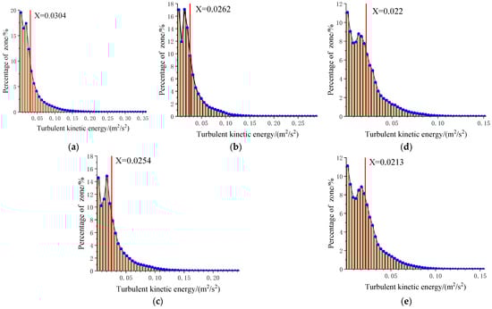 The proportion of each turbulent kinetic energy range. (a) Non-iterative; (b) triangular one; (c) triangular secondary; (d) rectangular one; (e) rectangular secondary.