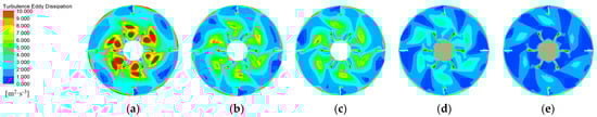 Turbulent dissipation rate at the center cross-section of the impeller. (a) Non-iterative; (b) triangular one; (c) triangular secondary; (d) rectangular one; (e) rectangular secondary.