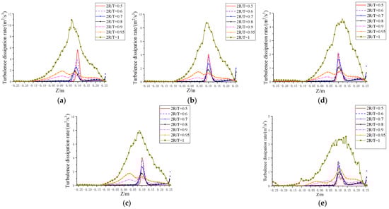 Longitudinal turbulent dissipation rate distribution. (a) Non-iterative; (b) triangular one; (c) triangular secondary; (d) rectangular one; (e) rectangular secondary.