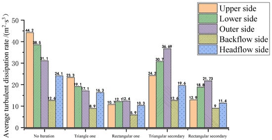 To further reveal the law of turbulent dissipation on the surface of fractal impellers, the surface weighted average turbulent dissipation rate of each side of the impeller was used to characterize the dissipation intensity, as shown in Figure 11.
