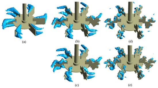 It can be seen that different fractal impellers have different turbulent energy dissipation near the blade, which may be related to the blade trailing vortex [33,34]. To verify the similar influence mechanism, the characteristics of the tailing vortex variation due to the fractal blade are investigated.