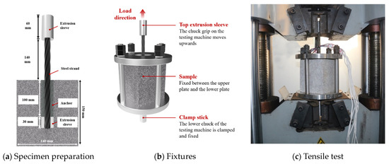 The specimen for the tensile test is shown in Figure 1a. The rock material used was granite from Qingdao, with dimensions of 15 cm × 15 cm × 18 cm. A hole with a diameter (d) of 3 cm and a depth of 130 mm was drilled in the center of the specimen surface, and a Φ15.2 mm steel strand with a length of 300 mm was chosen as the reinforcing body. This was a destructive test, and the anchoring agent’s bond strength with the rock mass could only be measured after the anchoring body was pulled out. To avoid the steel strand being pulled out of the anchoring body, a compression sleeve with a diameter of 30 mm and a length of 30 mm was pressed onto the end of the steel strand using a crimping machine (the bonding length between the anchoring body and the rock mass was 100 mm). A compression sleeve was also set at the front end of the steel strand for clamping via the testing machine.
