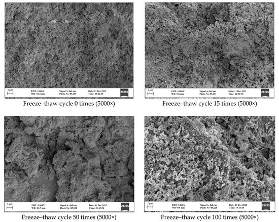 To more intuitively observe the microscopic morphological changes in the cement-based early-strength anchor material after freeze–thaw cycling, fresh sections of the samples with different cycle numbers were selected after uniaxial compression testing and were observed and analyzed using a scanning electron microscope (SEM) at a magnification of 5000 times after freeze-drying. The scanning images are shown in Figure 2.