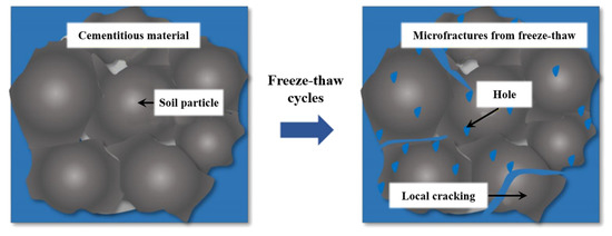 China has the third largest frozen soil area in the world, with the permafrost region accounting for 22.83% of the country’s land area. A large number of engineering constructions are distributed in the permafrost region, and after grouting and other engineering operations, the cementitious materials face the adverse effects of freeze–thaw environments [1]. The grouting body of cementitious materials is a composite body consisting of solid, liquid, and gas phases. Under low-temperature conditions, water freezes and expands in volume, exerting pressure on the two walls of the grouting body’s cracks. When the temperature rises, the ice melts into water, which penetrates into the interior of the structure through the pores on the surface of the grouting body, and at the same time, the pressure on the two walls drops sharply, causing a rebound [2]. The transformation between ice and water appears alternately on the surface and inside of the cementitious grouting body, and in repeated freeze–thaw cycles, the cracks will expand and increase, thereby affecting the mechanical properties of the cementitious materials [3].