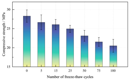 - After 5, 15, 25, 50, 75, and 100 freeze–thaw cycles, the average compressive strength of the samples decreased by 5.94%, 8.11%, 11.88%, 18.30%, 24.03%, and 27.62%, respectively, compared with the control group without freeze–thaw cycles. The compressive strength showed a decreasing trend with the increase in the cycle number.