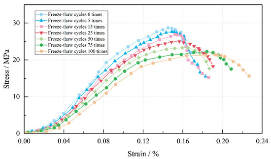 The stress–strain relationship reflects a material’s fundamental mechanical properties and is the primary basis for studying its mechanical strength and deformation characteristics [29]. In order to have a more intuitive understanding of the effect of freeze–thaw cycles on the strength and deformation of the cement-based early-strength anchor material, the stress–strain curves of the saturated specimens in each group of the experiment were compared under uniaxial compression testing. The results are shown in Figure 5. The compressive stress–strain curve of the cement-based early-strength anchor material specimen can be divided into four stages: the dense compression stage, the elastic growth stage, the yield stage, and the residual stage. During the initial compression stage, the specimen’s internal pores were gradually compacted and reduced, the specimen’s stiffness increased, and the curve showed an upward concave shape. The curve grew approximately linearly as compression continued, indicating that the specimen entered the elastic stage. When compression reached a certain degree, the curve no longer changed linearly. At this point, the internal damage to the specimen intensified, and the curve became concave, entering the yield stage. When the stress reached the peak value, the specimen failed, and the curve changed sharply. We continued to load the specimen, and the stress no longer increased, while the strain continued to increase, entering the residual stage. During the compression process, the stress–strain curve of the cement-based early-strength anchor material specimen showed a strain-softening type. After the stress reached the peak value, the specimen underwent brittle fracture, and the stress value dropped rapidly. As the number of freeze–thaw cycles increased, the compressive stress–strain curve of the cement-based early-strength anchor material specimen gradually decreased in the growth stage before yield, and the yield stage curve gradually flattened, with significant decreases in peak stress and curve slope. We believe that this was caused by the deterioration of the bonding relationship of the material by the freeze–thaw cycle; with the increase in the number of freeze–thaw cycles, at the microscopic level, the bonding relationship between the material particles was further destroyed under the action of the intermolecular force of water, resulting in microcracks and holes, and with the increasing number of freeze–thaw cycles, the holes and cracks continued to expand, further deteriorating the bonding relationship between the material particles. This resulted in a mechanical reduction in the maximum stress value to which the material was subjected. At the same time, the material no longer underwent the crack generation-propagation stage when it was pressed, but the existing cracks directly began to propagate, which corresponded to the gradual decrease in the slope of the stress–strain curve in the stage before the yield of the material mentioned above.