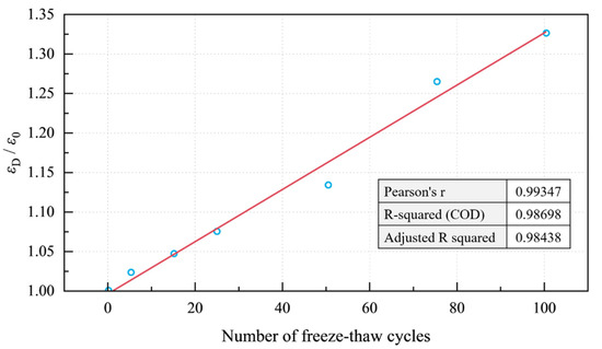 - As the freeze–thaw cycles increased, the growth segment of the curve before reaching the yield point decreased gradually, and the curve in the yield segment became smoother. The strain at the peak stress of the sample increased with the increase in the freeze–thaw cycle number, and the ratio of peak strain to initial strain εD/ε0 was linearly related to the cycle number. After reaching the peak stress, the sample underwent brittle failure.