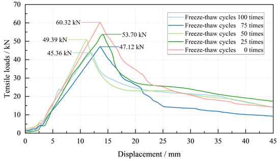 Based on the test results under normal curing conditions, the maximum bearing capacity of the cement-based early-strength anchor material bonded to the granite specimen interface was 60.32 kN. The maximum bearing capacities after 25, 50, 75, and 100 freeze–thaw cycles were 53.70 kN, 49.39 kN, 47.12 kN, and 45.36 kN, respectively. The load–displacement curves of each test block after freeze–thaw cycles are shown in Figure 7. It can be seen from the figure that with the increase in the number of freeze–thaw cycles, the compressive strength of the test block gradually decreased, and the two were positively correlated, and the maximum reduction in the test block strength was about 25%. Considering the microscopic performance of the test block after a freeze–thaw cycle, microcracks occurred in the test block due to the freeze–thaw cycle, and these microcracks continued to expand and expand with the increase in the number of freeze–thaw cycles, which further destroyed the interparticle bonding structure of the test block, so that the compressive strength of the test block decreased with the increase in the number of freeze–thaw cycles.
