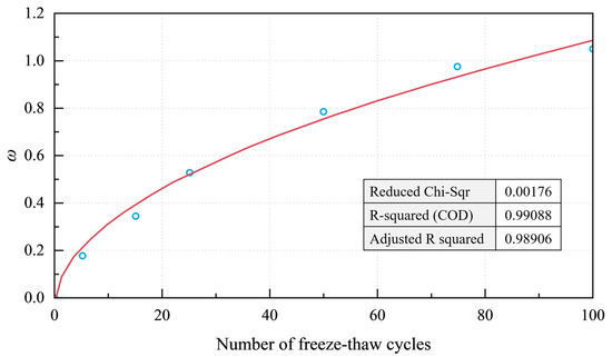 Based on the freeze–thaw test data, the relationship between the ω value and the number of freeze–thaw cycles is shown in Figure 9. The ω value comprehensively reflects the damage caused by mass loss and strength loss during freeze–thaw cycles and can be used to determine the degree of damage to the specimen through experimental measurement, which is influenced by the mass loss rate and bond strength loss rate [31]. According to Equation (3) and Figure 9, when the ω value is 0, it means that the specimen has not been damaged by freeze–thaw cycles; the smaller the ω value, the lesser the degree of damage caused by freeze–thaw cycles, and the larger the value, the greater the degree of damage. According to the specimen failure criteria defined in this experiment, when ω ≥ 1, the specimen is considered to have failed due to freeze–thaw effects. In this experiment, the degree of damage, or the ω value, of the cement-based early-strength anchor material specimen increased with the number of freeze–thaw cycles experienced, and the relationship between the degree of damage ω value and the number of freeze–thaw cycles was obtained by fitting, which can be expressed as:
